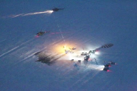 Winds pulled the descent module on its side in the snowy terrain, which is a common occurrence, but the crew was nonetheless swiftly hoisted out by the recovery crew and lifted onto reclining chairs and swaddled in blankets to shield them from the minus-11°C temperature.