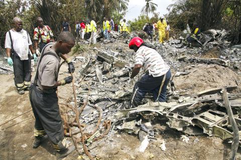 Investigators and UN peacekeepers picked through the charred wreckage of the aircraft amid a grove of palm trees near Charlesville, about 40km southeast of Monrovia. There were no survivors.