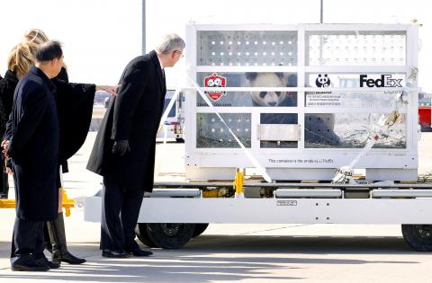 Two giant pandas arrived in Toronto from China on Monday at the start of a 10-year loan to two zoos. Speaking as the pandas arrived, Chinese Ambassador Zhang Junsai (章均賽) said that when he started his posting two years ago, he was greeted only by Ottawa’s director of protocol, but Er Shun and Da Mao merited a personal welcome from Prime Minister Stephen Harper. FedEx Corp, which flew the pandas, will fly in 600kg to 900kg of bamboo each week from the Memphis Zoo in Tennessee because “pandas are picky eaters,” it said.