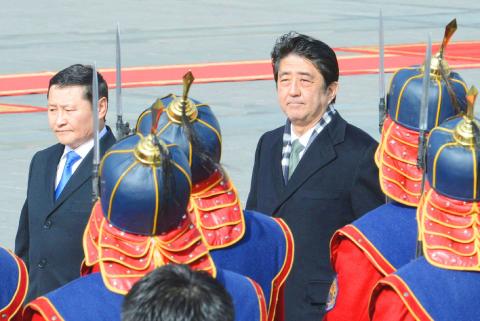 “I asked for Mongolian support relating to the Chinese situation and Mongolia expressed its understanding of the Japanese position,” Abe said in response to questions from journalists about the islands Japan claims as the Senkakus, Taiwan as the Diaoyutais (釣魚台) and China as the Diaoyu Archipelago (釣魚嶼).