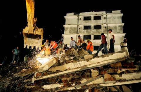DISASTER: The Bangladesh Meteorological Department recorded a magnitude 5.7 and tremors reached as far as Kolkata, India, more than 300km away from the epicenter A powerful earthquake struck Bangladesh yesterday outside the crowded capital, Dhaka, killing at least five people and injuring about a hundred, the government said. The magnitude 5.5 quake struck at 10:38am near Narsingdi, Bangladesh, about 33km from Dhaka, the US Geological Survey (USGS) said. The earthquake sparked fear and chaos with many in the Muslim-majority nation of 170 million people at home on their day off. AFP reporters in Dhaka said they saw people weeping in the streets while others appeared shocked. Bangladesh Interim Leader Muhammad Yunus expressed his “deep shock and sorrow over the news of casualties in various districts.” At least five people,