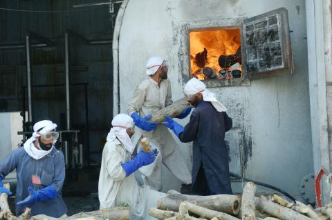 The factory needs gas to process, print and bleach fabric, but there is no gas four days a week, so instead they have set up a wood oven.