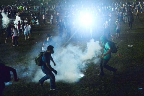 Brazilian police fired tear gas on Wednesday to disperse protesters near a stadium hosting a Confederations Cup soccer semi-final, as Brasilia adopted measures aimed at calming two weeks of social unrest.