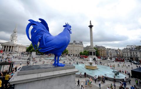A giant blue rooster was unveiled on Thursday next to the somber military monuments in London’s Trafalgar Square.