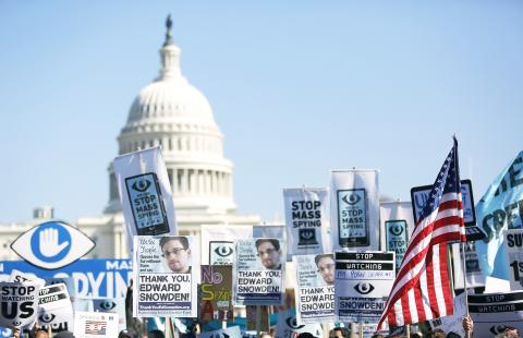 People carried signs reading: “Stop Mass Spying,” “Thank you, Edward Snowden” and “Unplug Big Brother” as they gathered at the foot of the Capitol to demonstrate against the online surveillance by the US National Security Agency (NSA).