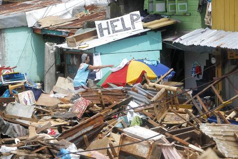 The buildings here make it look like a bomb went off in the center of town: Metal sheeting has torn huge gaping holes in shop fronts and flying debris has knocked statues off their pedestals. The flimsiest houses — those made of thatch and bamboo — have disintegrated organically into the hillside, the remnants of their insides scattered around like litter.