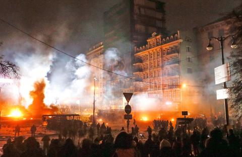 The clashes raged in the center of the Ukrainian capital until early yesterday morning, with demonstrators flinging Molotov cocktails and stones at security forces who hit back with stun grenades, rubber bullets and tear gas.