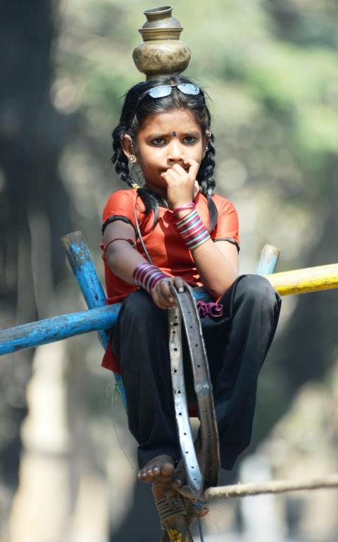 With a bronze pot balanced on her head and a painted bamboo pole in her hands, nine-year-old Barsati steps onto a tightrope nearly 2m above a Mumbai street.
