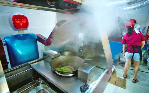 Mechanical staff greet customers, deliver dishes to tables and even stir-fry meat and vegetables at the eatery in Kunshan, which opened last week.