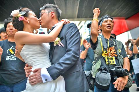 Showcasing phallus-shaped portable shrines and pink penis candies, Japan’s annual fertility festival yesterday teemed with tourists, couples and families elated by its open display of sex. The spring Kanamara Matsuri near Tokyo features colorfully dressed worshipers carrying a trio of giant phallic-shaped objects as they parade through the street with glee. The festival, as legend has it, honors a local blacksmith in the Edo Period (1603-1868) who forged an iron dildo to break the teeth of a sharp-toothed demon inhabiting a woman’s vagina that had been castrating young men on their wedding nights. A 1m black steel phallus sits in the courtyard of