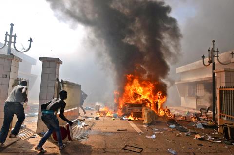 Thousands of protesters marched on Burkina Faso’s presidential palace after burning the parliament building and ransacking state television offices yesterday, forcing Burkinabe President Blaise Compaore to scrap a plan to extend his 27-year rule.