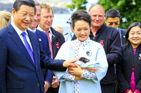 Xi and his wife, Peng Liyuan (彭麗媛), were warmly welcomed when they touched down in Hobart and were introduced to three orphaned baby Tasmanian devils, the black, furry native animal named for the state.