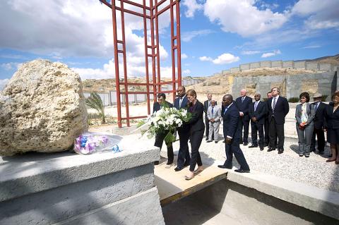 Before boarding their airplane, Power and Barros Melet left flowers on a memorial for victims of a January 2010 earthquake that reduced much of the capital to rubble.