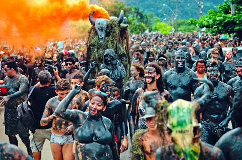 Revelers in the seaside colonial town of Paraty on Saturday threw themselves into deposits of black, mineral-rich slime, emerging covered head-to-toe in the sludge.