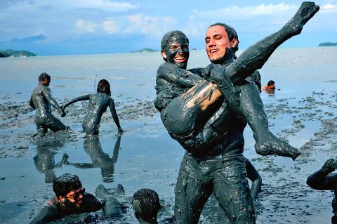 Bikinis and trunks disappeared beneath the mud, which highlights both gym-pumped pectorals and beer-fed guts.
