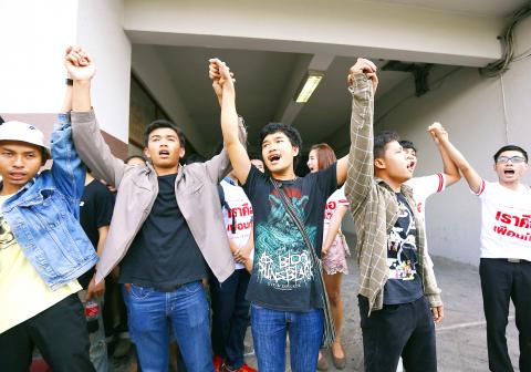 About 40 student gathered outside the court wearing white shirts with the words “We are friends” in Thai and English. Some raised a three-finger salute that has come to represent opposition to the junta.