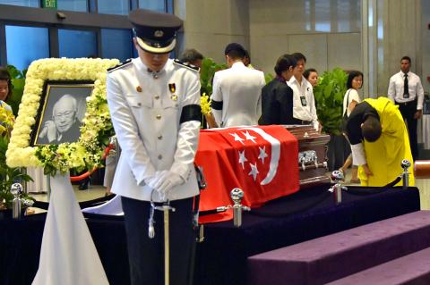 Thousands of people gathered in Singapore yesterday to bid farewell to former leader Lee Kuan Yew (李光耀) in an unprecedented wave of sympathy after authorities had to temporarily suspend queues overnight to manage surging crowds.