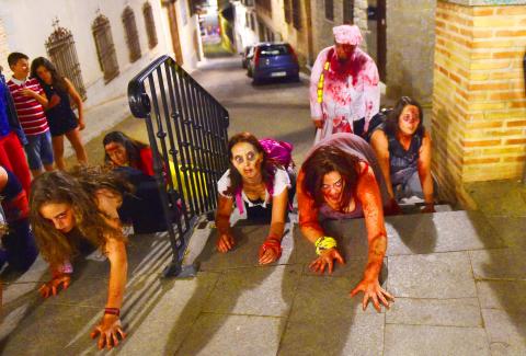 As night falls in a small Spanish village, horror movie fan Noelia Vacias prepares for a night as a zombie invasion survivor, her eyes glowing white from tinted contact lenses, her arms covered in fake blood. Nearby Enrique Morales wears a helmet and dark glasses and carries a fake gun.