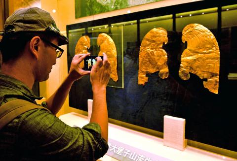 They include 28 golden plaques, but the star works are four large profiles of birds of prey, which would have been part of ceremonial riding tackle or decorated a dignitary’s coffin in the Zhou Dynasty.