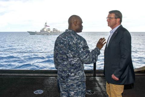 The Lassen had joined the carrier strike group the night before, ahead of a visit to the Theodore Roosevelt by US Secretary of Defense Ashton Carter, who while on board blamed China for rising tension in the region.