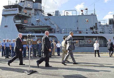 US President Barack Obama yesterday stood in front of a hulking Philippine Navy frigate and vowed to bolster security in the seas around the island nation — opening a six-day diplomatic tour in Asia that was likely to be divided between the region’s long-simmering disputes and more immediate concerns about Islamic extremism roiling Europe and the Middle East.