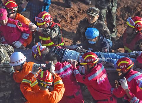 “The survivor had a very feeble voice and pulse when he was found alive buried under debris, and now he is undergoing further checks,” Wang Yiguo (王以國) told a news conference in Shenzhen, according to a transcript posted by the district government that covers the area.