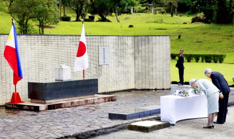 Clad in black and accompanied by Empress Michiko, they each laid a bouquet of white flowers and silently prayed near a marble cenotaph in the Japanese memorial garden along Lake Caliraya in Laguna province southeast of the Philippine capital.