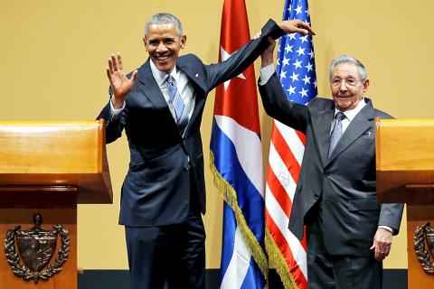 Obama then appeared to lean in to pat Castro on the back. In an awkward moment, the Cuban leader instead grabbed Obama’s arm and lifted it up as the US president’s wrist dangled, an image that grabbed attention on social media.