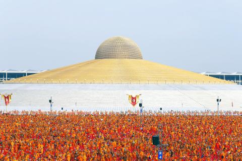 About 50,000 monks clad in orange robes chanted as devotees wearing white to symbolize the purity of the Buddha flocked to give alms at the Wat Phra Dhammakaya, famed for its enormous golden stupa that resembles an unidentified flying object.