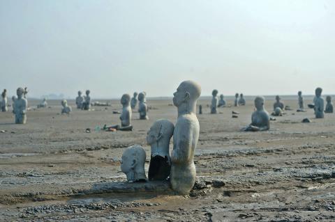 Visitors pose next to faceless statues lying semi-submerged in the mud, a silent reminder of the human toll of the disaster.