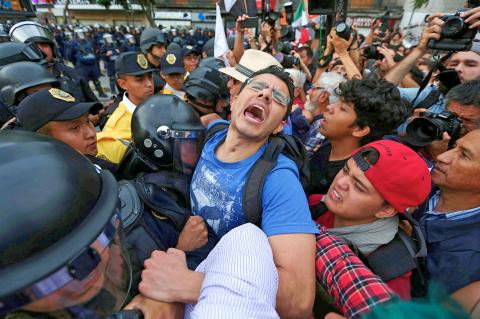 Parents of 43 students missing since Sept. 26, 2014, joined the protest, with people angry at the government’s failure to solve the case, almost two years after they were abducted by police and allegedly killed by a drug cartel.