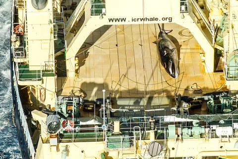 Anti-whaling group Sea Shepherd published a photograph on Sunday of a dead minke whale, that appeared to have been punctured by a harpoon, on the deck of the Japanese whaling vessel the Nisshin Maru. Video footage showed the dead whale later covered by a blue tarpaulin.