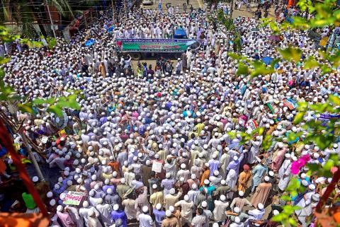 A huge crowd of demonstrators in white robes chanting “God is great” assembled outside Bangladesh’s largest mosque ahead of the planned “siege” of the embassy.