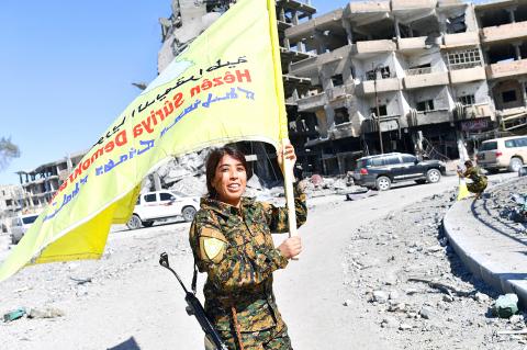 With his only hand, Hazem Kobane on Tuesday planted the yellow flag of the Syrian Democratic Forces (SDF) in the notorious roundabout in Raqqa where the Islamic State group carried out gruesome beheadings.