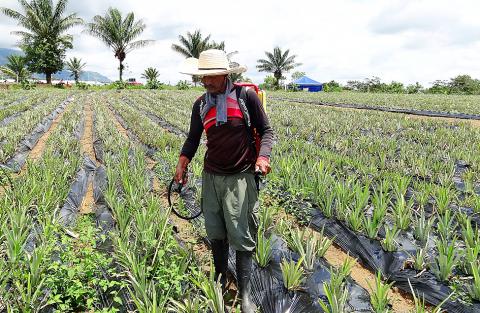 An anti-personnel mine tore off Salcedo’s left arm, he says as he sprays pesticides at the plantation of 20,000 young pineapple plants.