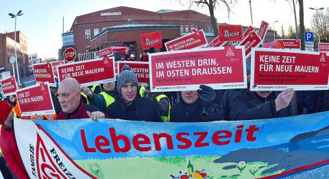 Germany’s powerful metalworkers union yesterday called for mass strikes over pay and working hours that could impact a key industry and the shape of labor nationwide.