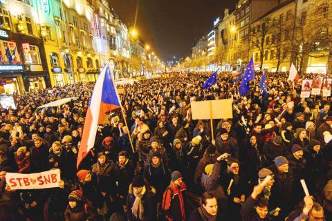 Chanting “communists are murderers” and “we have had enough,” protesters held sheets of paper rolled up to resemble police batons in an expression of indignation over the installation of Communist Party lawmaker Zdenek Ondracek as chair of the Czech parliament’s General Inspection of Security Forces Commission.