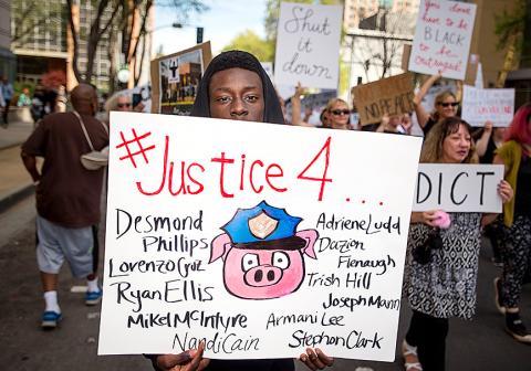 Waving signs and chanting Clark’s name in unison, the protesters gathered at city hall before marching into the Old Sacramento part of the city, filled with bars, restaurants and tourists.