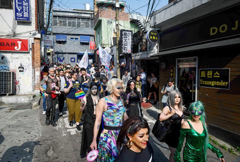 Dozens of drag queens and kings marched through Seoul’s Itaewon neighborhood on Saturday, which is best known for its nightlife and a nascent but vibrant gay scene.