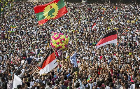 Saturday’s rally began as a show of exuberance, with supporters wearing clothes displaying Abiy’s image and carrying signs saying “One Love, One Ethiopia.”