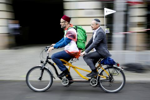 Twenty-five Jews and Muslims rode tandem bicycles through the German capital on Sunday in a protest against growing anti-Semitism and attacks on Muslims in the nation.