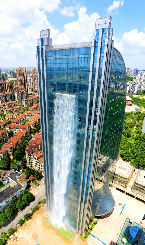 Constructed by the Ludi Industry Group, the building is to house a shopping mall, offices and a luxury hotel. Its signature waterfall uses runoff, rainwater and groundwater collected in giant underground tanks.