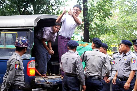 Wa Lone smiled broadly and made a thumbs-up sign with his hands in cuffs as he walked into the court, with Kyaw Soe Oo just behind him.