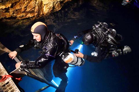 She was one of a group of hobby divers and speleologists, wearing dry suits and carrying double cylinders of compressed gas on their backs, who descended into the gloomy waters, the light from their torches gradually fading out of view.