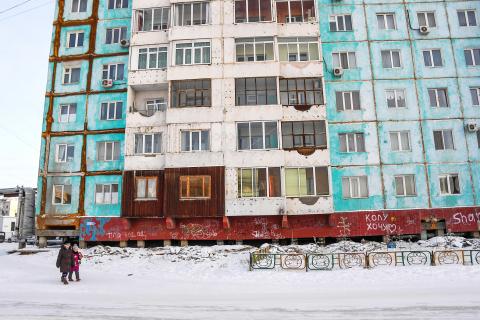 Most Soviet-era apartment blocks in Yakutsk are made of concrete panels and stand on stilts to ventilate the building’s underside and prevent it heating the permafrost, a layer of soil cemented together with water that is only stable as long as it stays frozen.