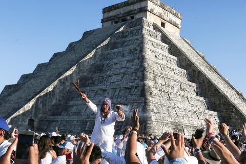 Dressed in traditional indigenous garb, dancers performed ceremonies at these and other sites, including the nearly 2,000-year-old sun pyramid of Teotihuacan, near Mexico City.