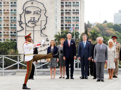 The heir to the British throne arrived in Havana and laid a wreath at the memorial to colonial independence hero Jose Marti, near massive portraits of socialist revolutionary icons, including guerrilla fighter Che Guevara.