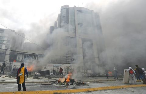 Demonstrators on Saturday ransacked and set fire to the building housing the Ecuadoran comptroller general’s office, which was shrouded in thick smoke after being attacked with Molotov cocktails.
