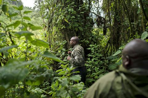 Biologist Jean Paul Hirwa notes her meal on his tablet computer as he peers out from behind a nearby stand of stinging nettles.