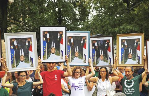 Several brought stolen portraits to a march at the G7 summit Macron hosted in Biarritz in August, to try to embarrass him at the global event.